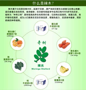 辣木树已成为2013年欧美日等国家和台湾地区的新兴保健食品,它的特点是高钙、高蛋白质、高纤维和低脂质,成为人们提高生活及饮食品质,增强免疫力,促进身体健康,预防疾病的神奇植物。华盛顿大学博士奥尔生受美国国家科学基金会、国家地理学会等组织委托专门研究辣木,他发现辣木营养超级丰富,各种营养素和必须氨基酸都一应俱全,对人类健康有相当的帮助。