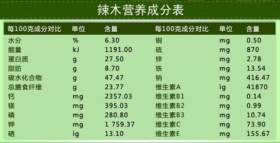 含有丰富的碳水化合物、钙、铁、维C等,具有保健功能。由云南三高辣木的专利技术研制而成的辣木普洱养生茶,分为生、熟两种,采用袋泡包装,辣木和普洱茶互相补充,回甘好,余味悠长。