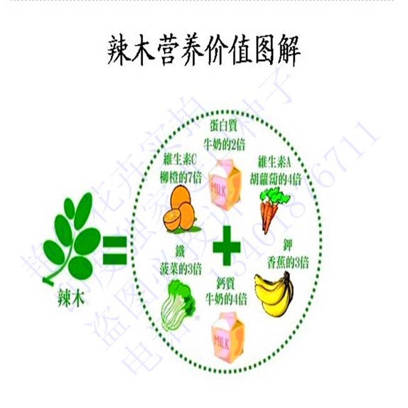 【叶】:辣木树叶含有丰富的钙、铁和高量白胺酸,非常适合治疗忧郁症、降低血压和减肥塑身。辣木嫩叶和嫩豆荚更是味道鲜美且营养丰富的绿色木本蔬菜(辣木当年种可当年采摘嫩叶、嫩茎,采集期每年长达10个月)。嫩叶味道有点像菠菜,豆荚外形类似菜豆,味道像芦笋,开水烫熟加佐料凉拌或煮汤皆宜。