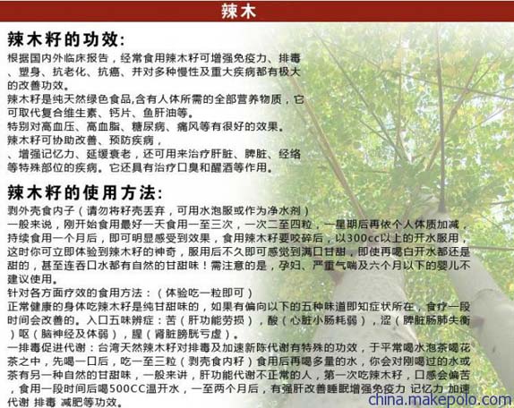【籽】:辣木树籽可以用来治疗肝脏、脾、经脉等特殊部位的疾病和破伤风。从种子中提取的辣木油油质清澈芳香,是优良的食用油,可治疗多种疾病。辣木籽干物质中,含有粗蛋白32.50、粗脂肪31.30、粗纤维18.40,具有强烈的降血压、降血脂、降血糖、抗癌的作用,药用和保健作用极高。辣木种子具有抗抗金黄色葡萄球菌之活性,可用于皮肤感染的治疗。辣木油含油率达30%,可美白肌肤,防老化,去除皱纹,淡化斑点,消除青春痘。